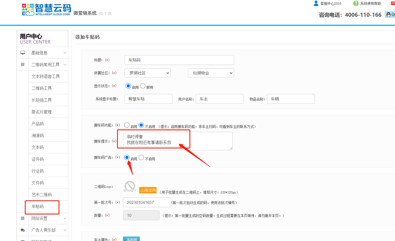 挪車碼廣告,可以在挪車碼底部添加上廣告,廣告的添加位置如下圖: