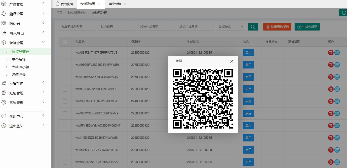 3.成功創(chuàng)建一批包裝碼,可以根據(jù)包裝碼,條形碼,生產(chǎn)批次,創(chuàng)建時間,和發(fā)貨狀態(tài)等條件進(jìn)行搜索。