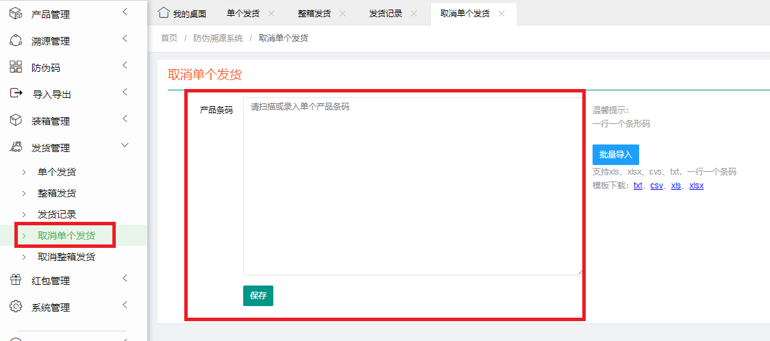 2.點(diǎn)擊【保存】即可取消發(fā)貨。也可以模板批量導(dǎo)入。支持xls、xlsx、cvs、txt,一行一個條碼。