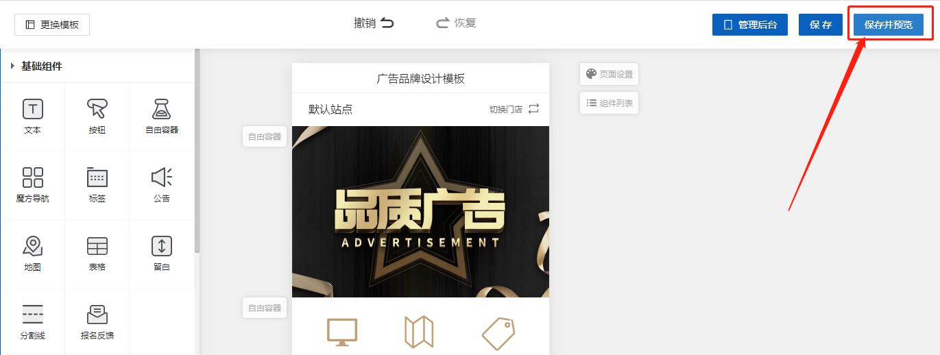 注意:在編輯器內進行的所有設計都必須在右上角點擊保存或者保存并預覽后才會生效,如未保存退出編輯器頁面則一切都會重置。