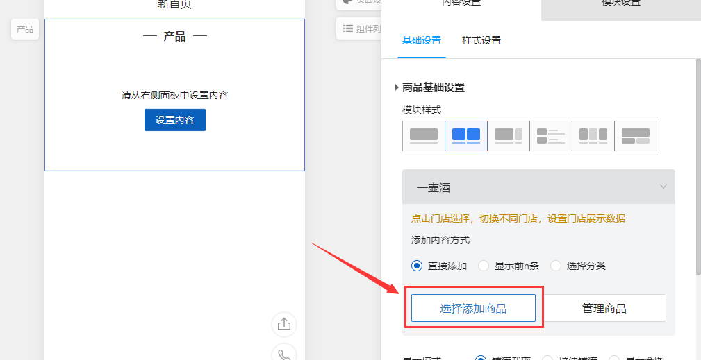 單擊產品組件添加至頁面。在右側選擇添加模式直接添加,點擊選擇添加商品,勾選需要添加的商品,再點擊確認,即可添加完成。如下圖所示: