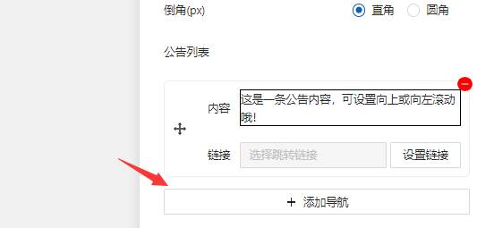 添加公告組件,在右側設置內容,右側的重置可以將選項都初始化。添加內容項,點擊【添加導航】。如下圖所示: