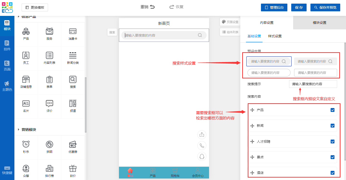 添加一個搜索組件,在右側選擇預設的樣式,以及勾選檢索的范圍。如下圖所示: