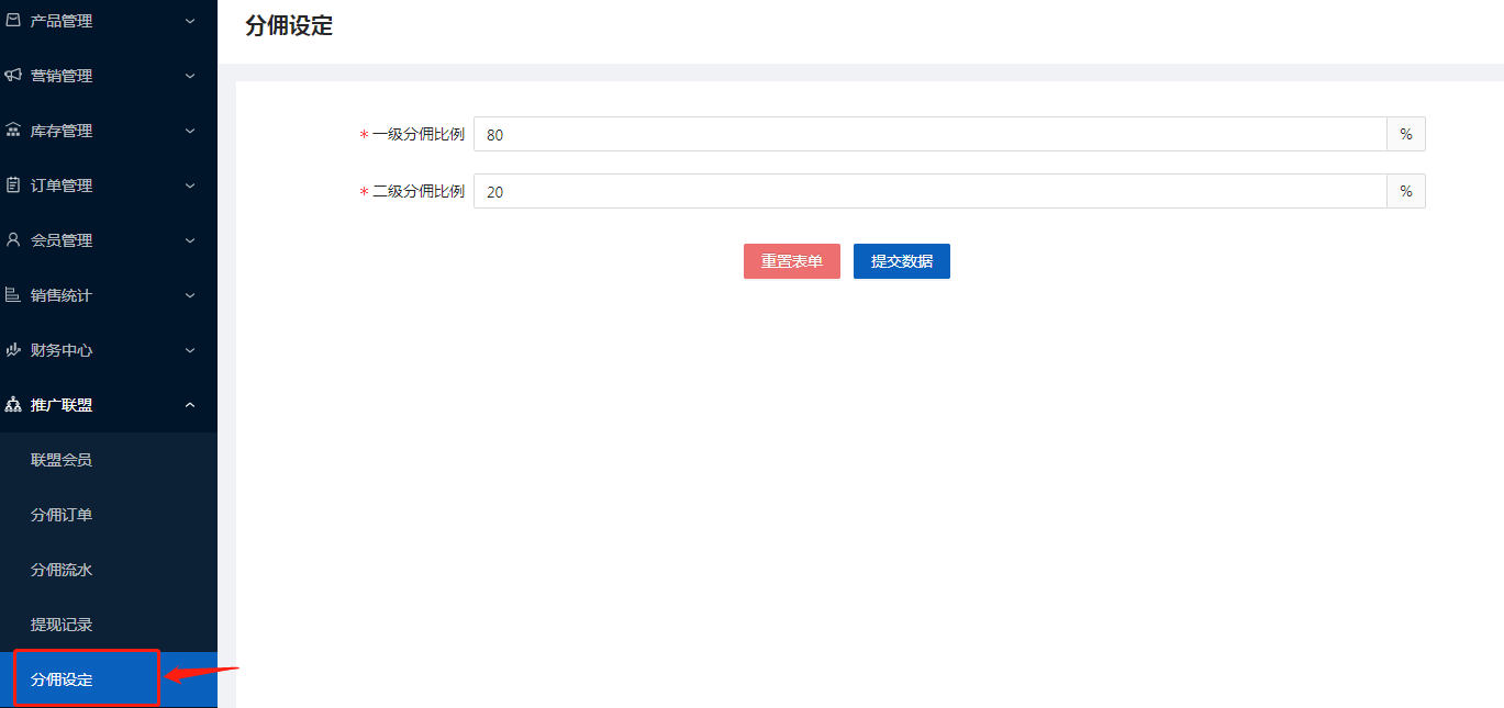 分傭設定:當商品設置參與推廣聯盟,那么設置的分傭比例,會根據設置的一級分傭比例和二級分傭比例劃分,一級的分配比例,二級的分配比例(一級+二級的比例等于100%)如下圖所示:
