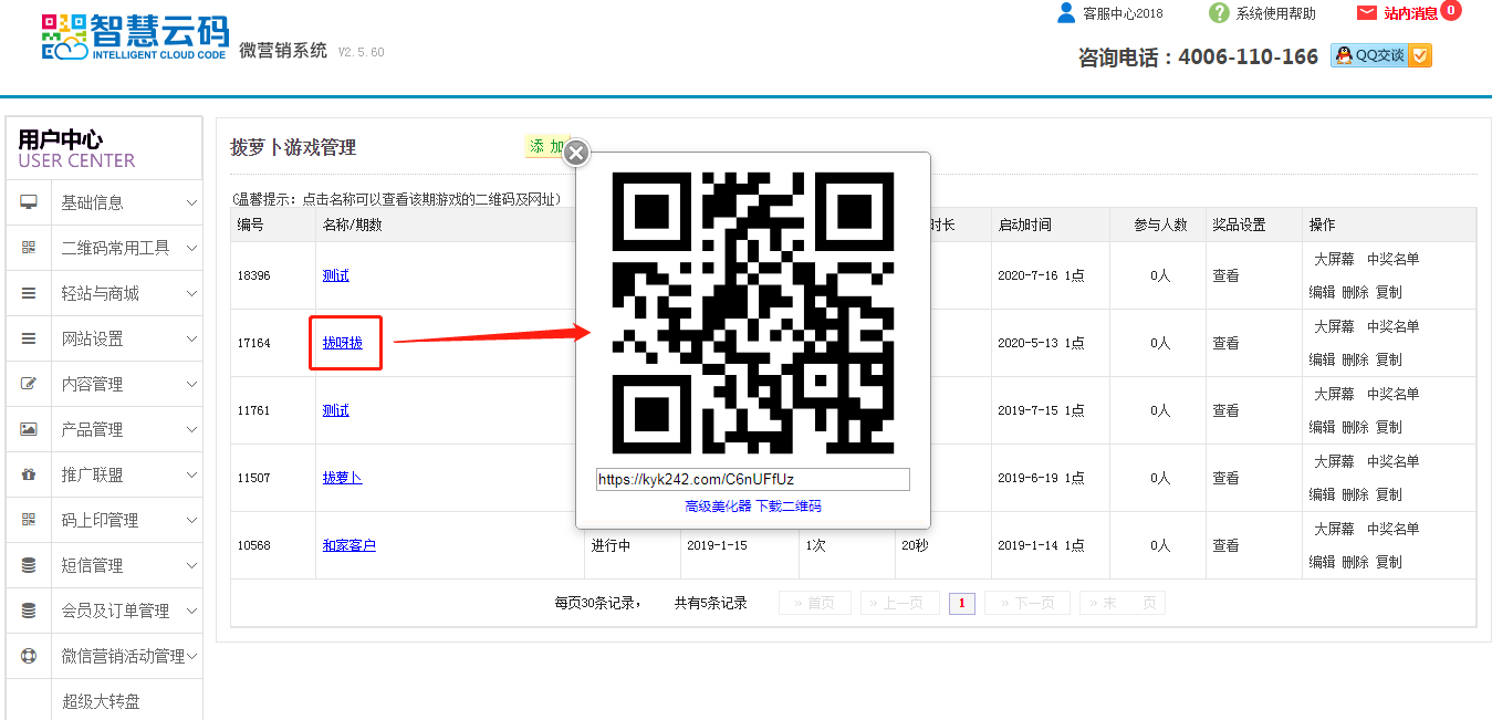 狀態(tài)默認選擇為啟用,當游戲結(jié)束后,可把該游戲狀態(tài)改成不啟用,則意味該游戲已經(jīng)結(jié)束了,用戶掃碼就不能參與該游戲了;